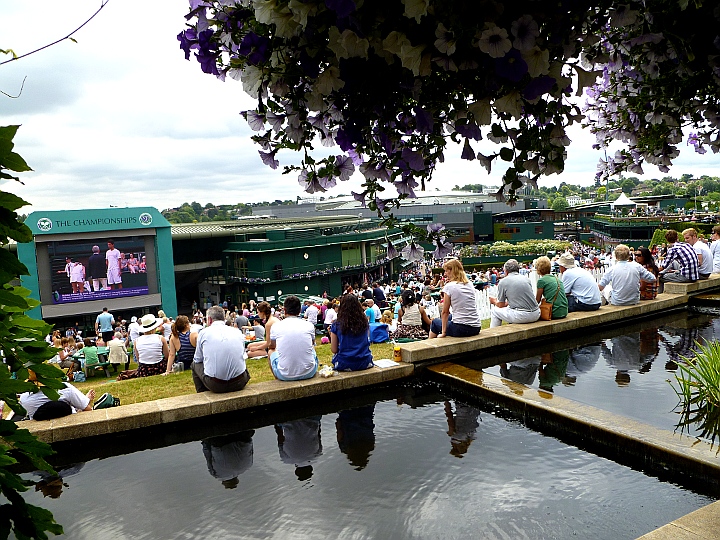 Our first full day in London was spent trying to secure tickets for Wimbledon with no luck. At noon, the tournament sold returned tickets on Ticketmaster. We tried getting returns for hours. Also at 8:30pm, 400 more tickets were released for the back row of Center Court. Many more hours on the website and no tickets. It looked like we would have to go to Wimbledon and wait in “The Queue”. The next day, arriving on the edge of the tournament grounds, we were greeted by overly-friendly Wimbledon stewards who directed us through a gate for non-ticket holders. A walkway led to a grassy field with greeting stewards directing us to the end of the queue where another steward gave us our queue number: 8486. The stewards said we had a good chance of making today’s cutoff of 8500, at which time the entrance gate would close. It was 10:30. Once our section of the queue was situated, the roving stewards suggested for everyone to sit because it would be awhile before we moved. It felt like a big picnic in the park, with occasionally moving forward and sitting back down. At 12:30 we made it through the gate and then the gate closed behind us. We were the last in! We went through an airport-type security and purchased our 20 pound field pass and headed for the schedule board to see where the Isner/Mahut continuation would be. It was the 3rd match on Court 18. We were lucky again because the outside court matches started at 12:00. No one left Court 18 until after first match and then only about 20 people left. We got 2 of the remaining 10 seats and watched the Pennetta/Niculesu match. No one left after that match! There was a one-hour delay before Isner/Mahut and a feeling of something special was about to happen was filling the air. Court 18 was now swamped with fans around it and walkways were jammed up with no movement. Click the scoreboard for a summary of the longest tennis match in history 70-68 in the fifth set,