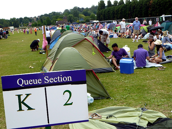 Our second day in “The Queue” was a disaster. We did not make the cutoff. It took 6 hours in “The Queue” before we got in. We experienced Queue fatigue! We missed all the early matches. Once in, we decided to watch Mayer on a small court thinking it was the same entertaining Mayer we saw at the French Open. It was not Leonardo but Flavian Mayer. But what we did see was this guy named Lu, who we never saw before. He was terrific. He later took out Roddick in the tournament. Before leaving, we stopped in at some other matches and roamed the grounds, particularly Henman hill, which is a great jumbo TV viewing experience. Back at the apartment, we decided to use both of our computers to try to get tickets. Within minutes, Ann got lucky with 2 Center Court tickets.
